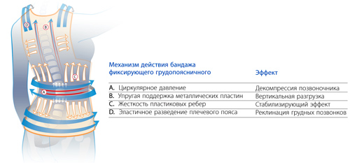 Обеспечивает стабилизирующий эффект и умеренную фиксацию грудного и пояснично-крестцового отделов позвоночника, сохраняя необходимую свободу движений и не ограничивая грудное дыхание.