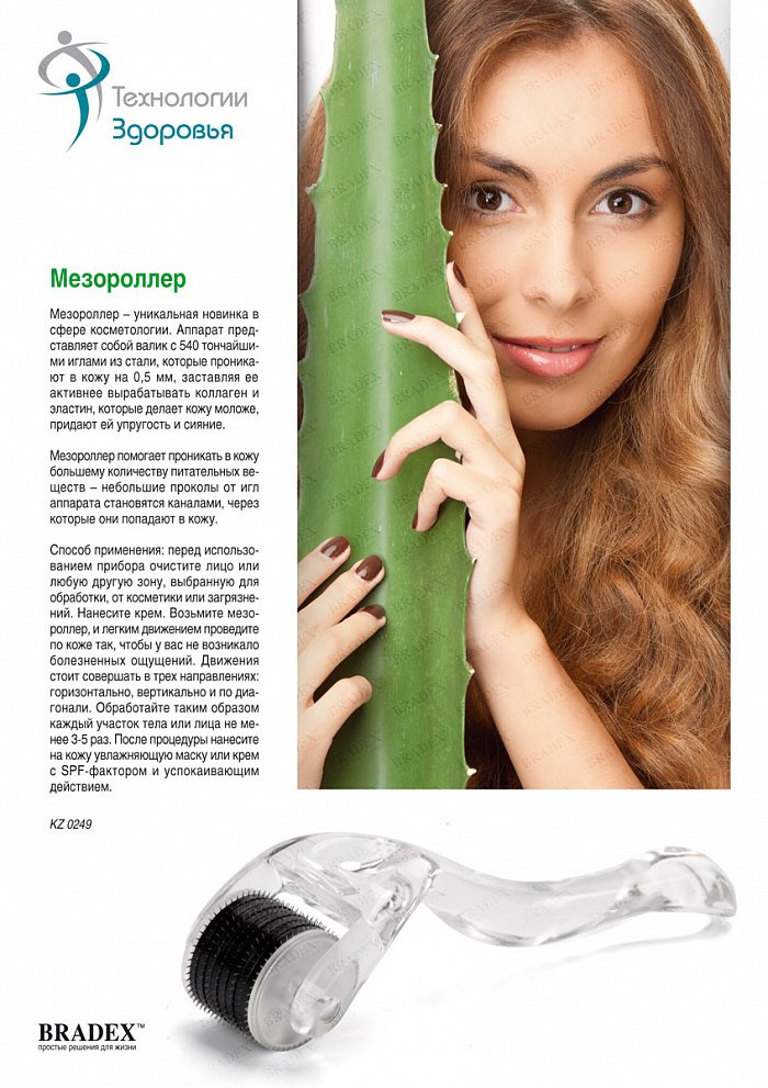 Способ применения: перед использованием прибора очистите лицо или любую другую зону, выбранную для обработки аппаратом, от косметики или загрязнений. Нанесите крем или маску. Возьмите мезороллер так, чтобы он удобно располагался в руке, и легким движением проведите по коже так, чтобы у вас не возникало болезненных ощущений. Движения стоит совершать в трех направлениях: горизонтально, вертикально и по диагонали. Обрабатывайте таким образом каждый участок тела или лица не менее 3-5 раз. После процедуры нанесите на обработанный участок кожи увлажняющую маску или крем с SPF-фактором и успокаивающим действием. Важно! Мезороллер стоит обрабатывать дезинфицирующим раствором перед и после каждого применения. Чтобы усилить эффект аппарата не стоит загорать 2-3 дня после процедуры. Противопоказания к использованию мезороллера: 1) беременность. 2) Период лактации. 3) Инфекционные и воспалительные процессы в зоне воздействия. 4) Эндокринные патологии: сахарный диабет. 5) Новообразования кожного покрова любого генеза. 6) Нарушения системы свертываемости крови. 7) Много родинок и бородавок на выбранном участке.