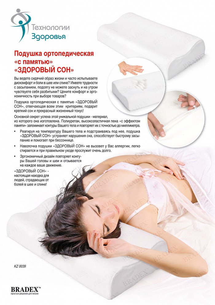- Реагируя на температуру Вашего тела и подстраиваясь под нее, подушка «ЗДОРОВЫЙ СОН» способствует быстрому засыпанию и обеспечивает комфортное положение вашей шее и голове.
