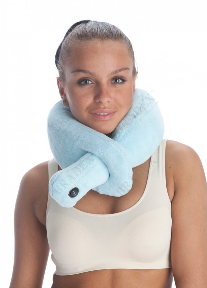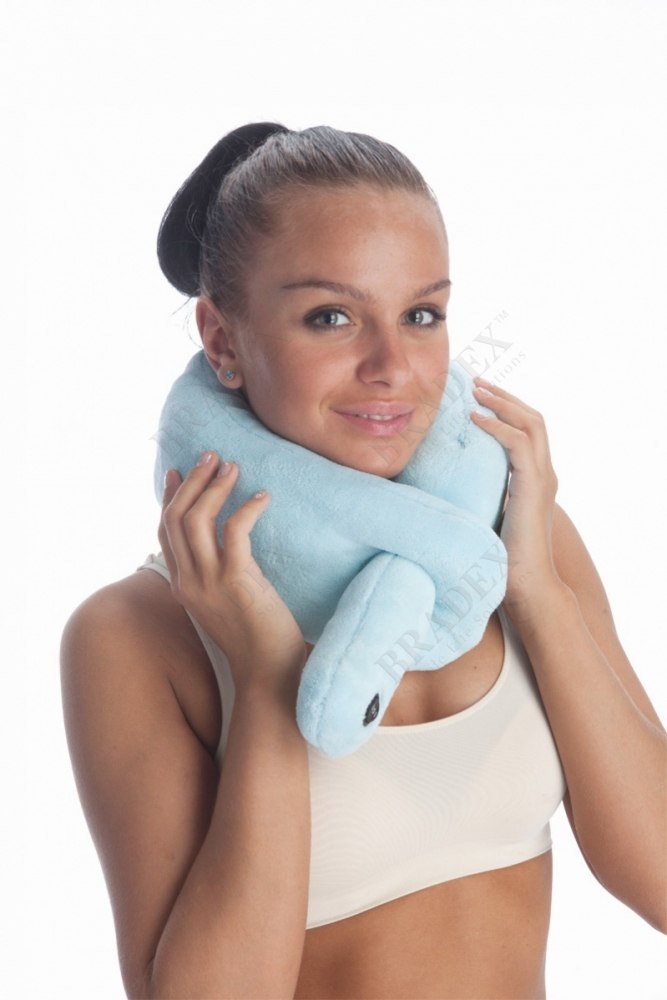 "Этот чудо-шарф питается от двух стандартных пальчиковых элементов питания АА типа и способен работать в двух режимах массажа (лёгкий массаж и интенсивный массаж), которые можно легко выбрать при помощи удобного переключателя. Массажный шарф также можно использовать как дорожную подушку.