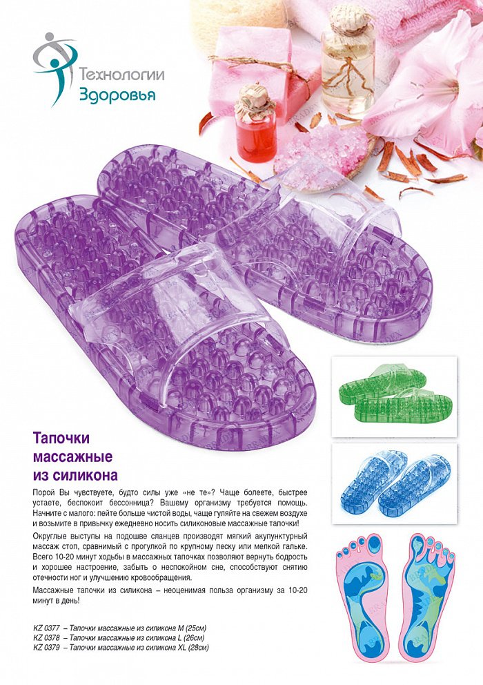 Работа, домашние хлопоты и уход за детьми отнимают все Ваши силы и время? Напряженный график и постоянный недосып отражаются на здоровье и внешности? Массажные тапочки из силикона помогут восстановить силы и вернуть Вам бодрость духа всего за 10-20 минут в день! • Изделие оказывает общеукрепляющее воздействие, повышает защитные функции организма, помогают снять усталость и отечность ног. • Акупунктурный массаж важных точек на стопе способствует улучшению сна, эмоционального состояния и расслаблению после напряженного рабочего дня. • Тапочки выполнены из качественного силикона: они легко очищаются и не впитывают запах, подходят для использования в бассейне и сауне. Силиконовые массажные тапочки: эффективная поддержка организма для самых занятых!