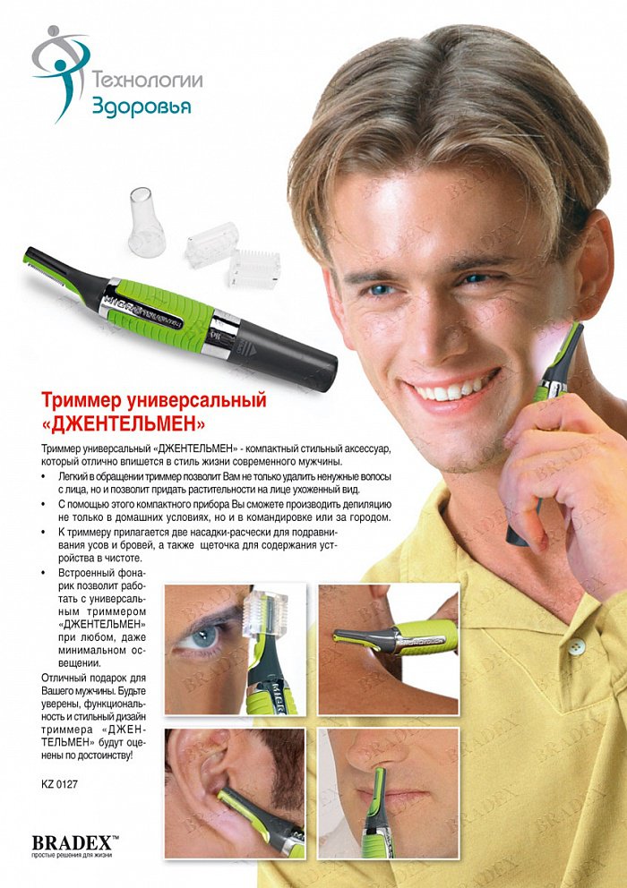 Триммер универсальный «ДЖЕНТЛЬМЕН» - компактный стильный аксессуар, который отлично впишется в стиль жизни современного мужчины. - Легкий в обращении триммер позволит Вам не только удалить ненужные волосы с лица, но и позволит придать растительности на лице ухоженный вид. - С помощью этого компактного прибора Вы сможете производить депиляцию не только в домашних условиях, но и в командировке или за городом. - Встроенный фонарик позволит работать с универсальным триммером «ДЖЕНТЛЬМЕН» при любом, даже минимальном освещении. - Стильный и компактный аксессуар – идеальное решение для имиджа современного джентльмена! - Отличный подарок для Вашего мужчины. Будьте уверены, функциональность и стильный дизайн триммера «ДЖЕНТЛЬМЕН» будет оценены по достоинству.
